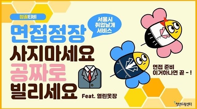 안녕하세요, 청년드림센터 인턴 청꿀이와 드림이입니다~! 면접 정장 어디서 빌리시는 지 모르신다구요?무료로 면접 정장 빌리는 방법 바로 청꿀티비가 알려드…