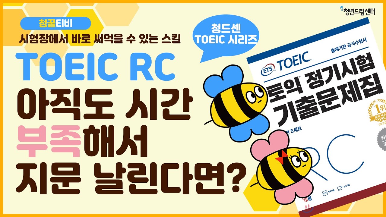 안녕하세요 청꿀티비 이번주 꿀팁은저번주 LC꿀팁에 이어서, 시간관리가 생명인 토익 RC꿀팁을 준비했어요~청꿀이와 드림이가 실제로 직접 모아 모아 놓은 실전 꿀팁…