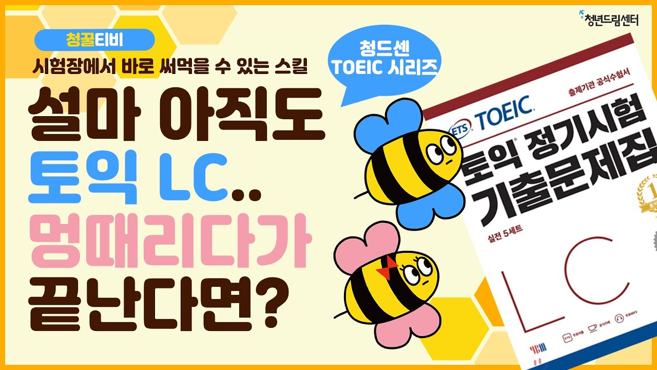 안녕하세요,청꿀티비 이번주 꿀팁은이번주 일요일 11/24에 있을 정기 토익 시험 보시는 분들을 위해 실전! 토익 LC꿀팁 편을 가져왔어요 ~ 청꿀이와 드림이가 실제로 직…