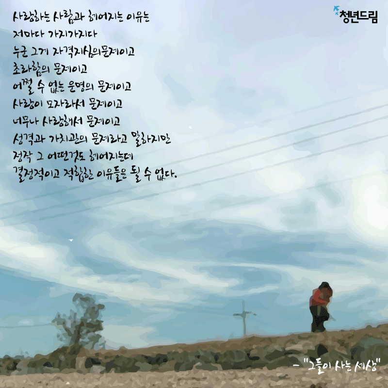[ ] [당신에게 드림] #422 사랑하는 사람과 헤어지는 이유는 저마다 가지가지다 누군 그게 자격지심의문제이고 초라함의 문제이고 어쩔 수 없는 운명의 문제이고 사랑이 모자라서 문제이고 너무나
