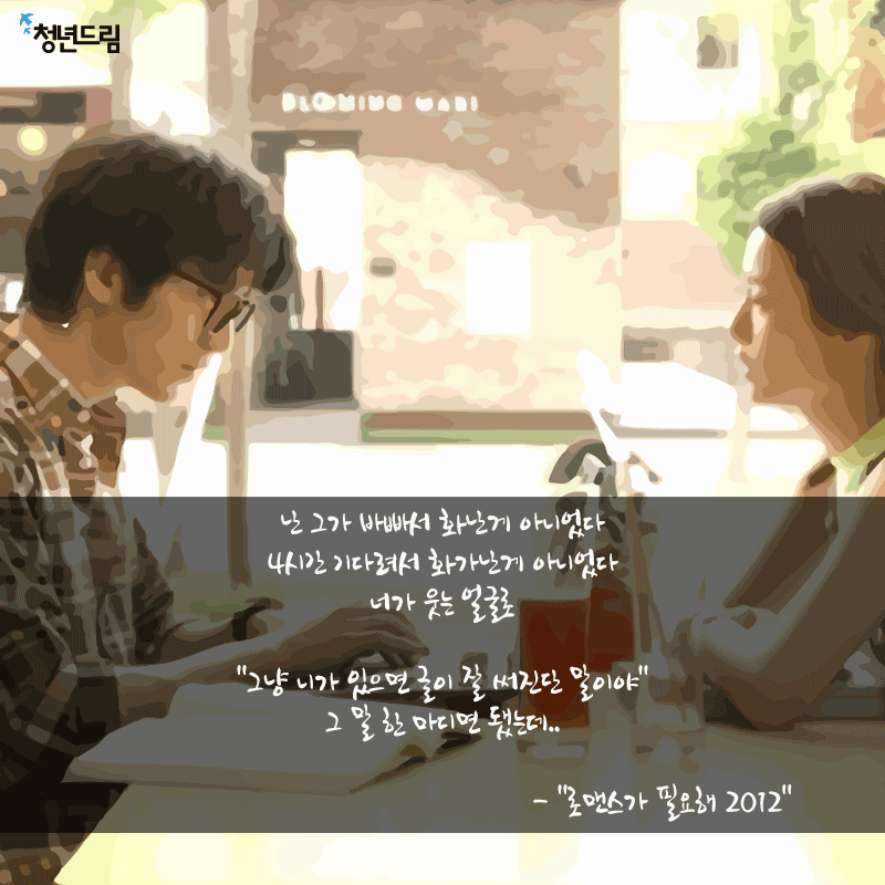 [ ] [당신에게 드림] #425 난 그가 바빠서 화난게 아니었다 4시간 기다려서 화가난게 아니었다 너가 웃는 얼굴로 "그냥 니가 있으면 글이 잘 써진단 말이야" 그 말 한 마디면 됐는데..