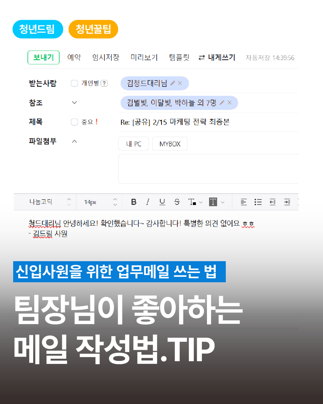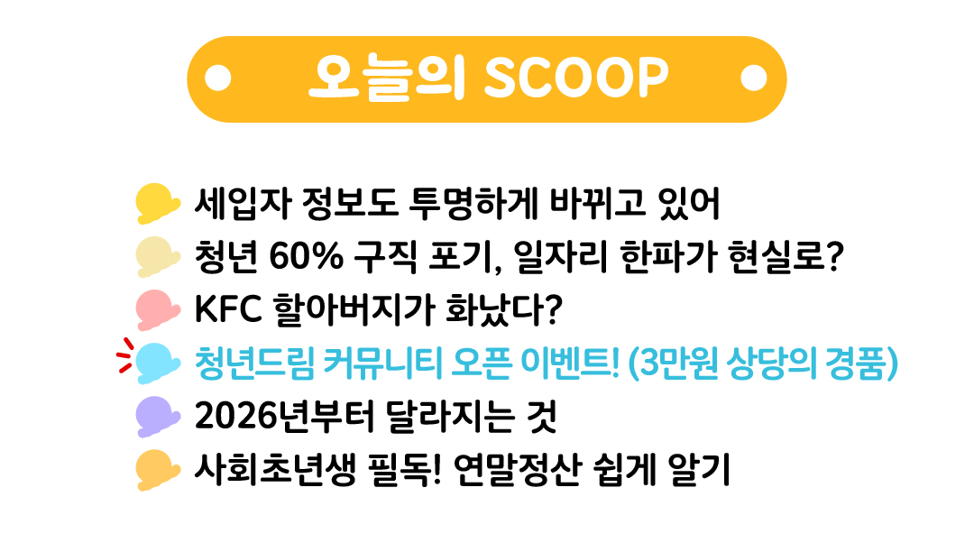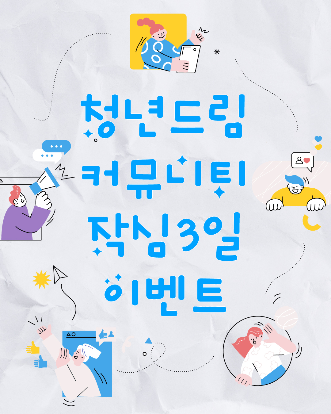 | ✍️ 청년드림 커뮤니티 작심3일 글쓰기 챌린지 드림이들 안녕! ? 청년드림 커뮤니티를 더욱 활발하게 만들기 위해 청드가 특별한 이벤트를 준비했어! 새롭게 오픈한 청년드림 커뮤니티에 3일동안 글 작성하면 ❗️무조건❗️ 3만원 상당의 경품을 줄게? |